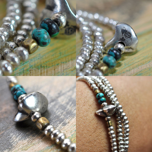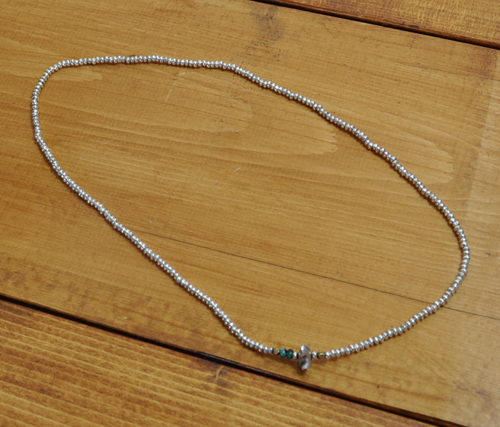 一粒一粒を全て手作業にて削り出し成形をして製作したターコイズ、シルバービーズを使用したアクセサリー。こちらの商品は3重巻きでブレスレット、1重巻きでネックレスの仕様となります。どんなコーディネートにも合わせ易く、ユニセックスでご使用して頂けます。トップのシルバービーズには〈39〉のロゴが彫り込まれています。